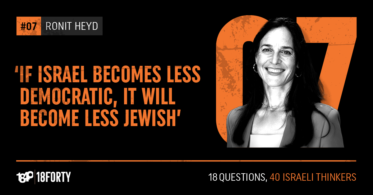 If the country is less democratic, it will be less Jewish. You cannot separate the two. Hi, I’m Ronit Heyd. I am a Jerusalemite and a social change activist and leader. This is 18 Questions, 40 Israeli Thinkers from 18Forty.